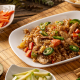 Laitue, tomates, concombre, pomme de terre, avocat, carotte, riz, crevettes, poulet, mozzarella boule, sauce pesto