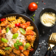 salade niçoise, pâtes bolognaises, émincé de poulet, légumes sautés, riz, purée de pomme de terre, frites, Gâteau maison